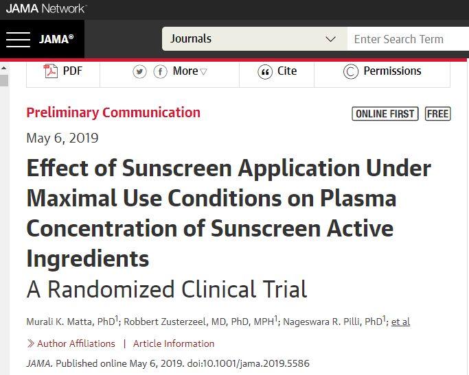 要計劃進行的一系列研究中, 現(xiàn)在,F(xiàn)DA研究人員的一項初步研究表明,這些防曬成分實際上可能通過皮膚吸收的水平高于之前認知的水平。這項研究工作于今年5月6日發(fā)表在《美國醫(yī)學會雜志》(Journal of the American Medical Association)上。
