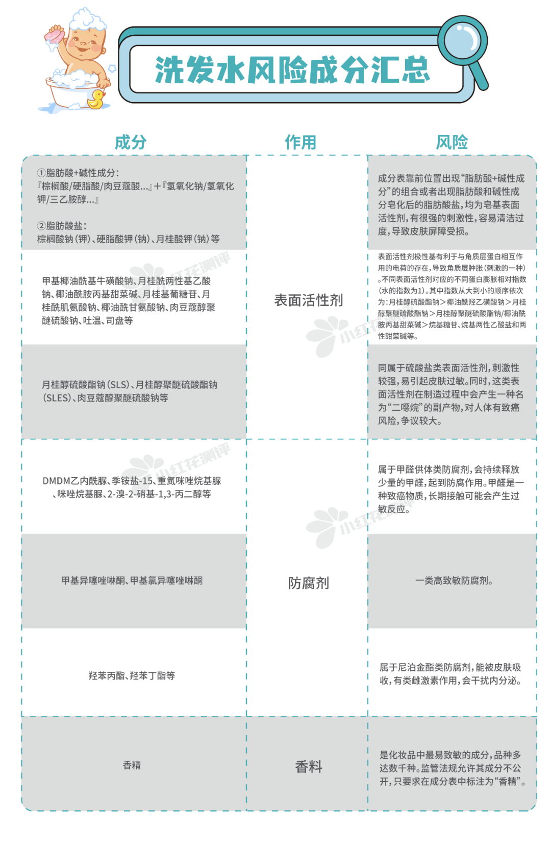 考慮到洗發(fā)水的停留時間短,花爸在此處僅做提醒,頭皮敏感的寶寶要注意。
