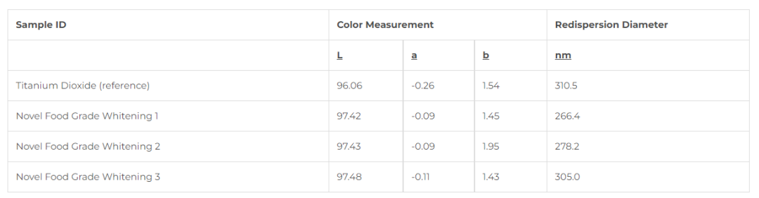 這款食品級(jí)增白劑對(duì)各種場(chǎng)景的應(yīng)用具有熱穩(wěn)定性和pH穩(wěn)定性,與二氧化鈦的性能相匹配,同時(shí)克服了其問(wèn)題。據(jù)了解,Blue California正在申請(qǐng)專利的食品級(jí)增白劑具有與傳統(tǒng)二氧化鈦相似的直徑大小,具有更高的L值(更白),如下表所示。
