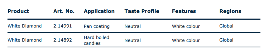 該原料與其它成分兼容性比較好且酸穩(wěn)定,應(yīng)用范圍包括烘焙奶油、粉末飲料、硬糖以及各種糖果的包衣等,為其提供增白解決方案,為高性能天然白色解決方案提供了全新的可能性。