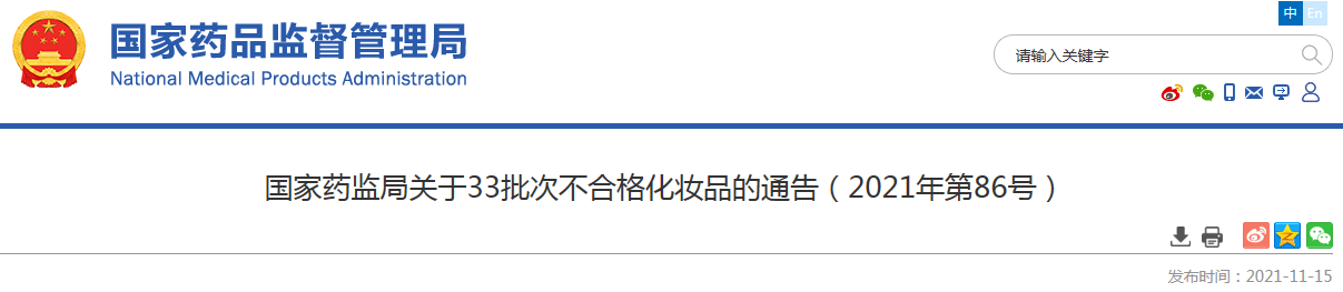 中國(guó)質(zhì)量新聞網(wǎng)訊 2021年11月15日,藥監(jiān)局網(wǎng)站發(fā)布關(guān)于33批次不合格化妝品的通告(2021年第86號(hào))。