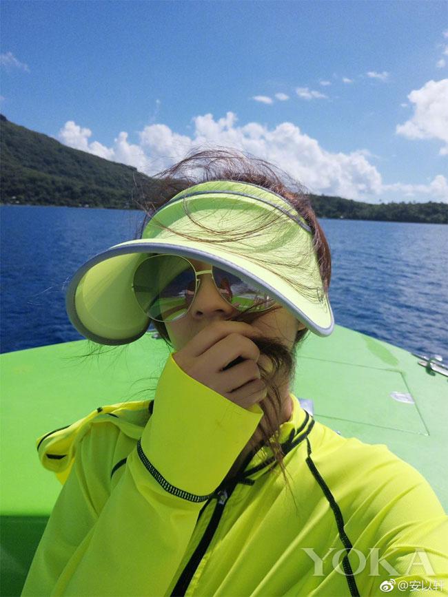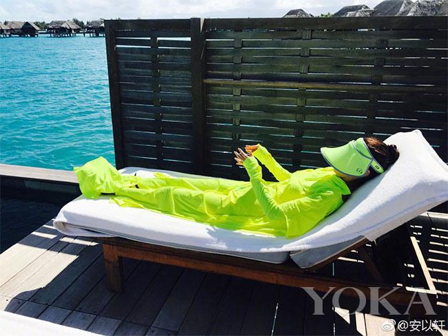 安以軒去海邊度假,為了防曬也是也是煞費苦心。從頭到腳都被熒光色的防曬衫裹完了,只剩十根手指頭還暴露在陽光下。