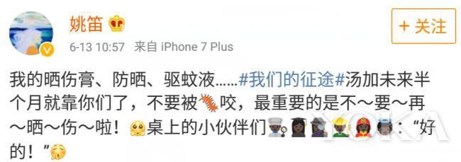 姚笛在赤道附近的錄節(jié)目,外出半個月,必備的也是曬傷膏和防曬霜。滿滿的一桌子: