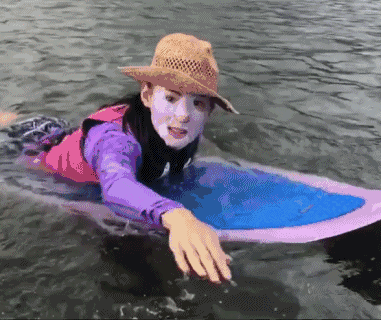 對,你沒看錯,下水后的張柏芝換個草帽,直接戴著面膜上陣,在滑浪板上游來游去~~