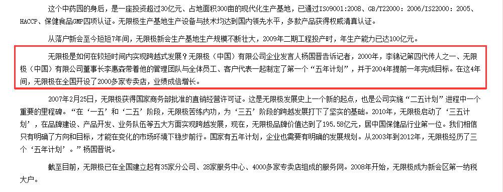 其中,一則題為“無限極真實的故事——白血病患者煙臺王曉霞”的文章中寫道,已經(jīng)被下了五次病危通知書的白血病患者煙臺王曉霞,遇到了無限極中醫(yī)宣傳員,并開始服用增健、靈芝皇。七天之后,王曉霞的精神氣一點點好轉(zhuǎn),三個月后便能下地活動,并走上了健康之路。