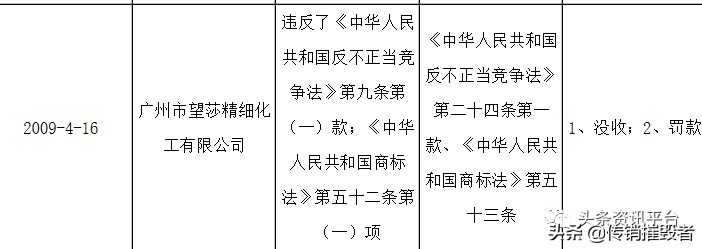 2009年,廣州市工商行政管理局經(jīng)檢分局發(fā)布2009年1月1日至6月30日行政處罰信息表(二),廣州市望莎精細(xì)化工有限公司名列其中,該公司違反了《反不正當(dāng)競爭法》第九條第(一)款;《商標(biāo)法》第五十二條第(一)項(xiàng)。