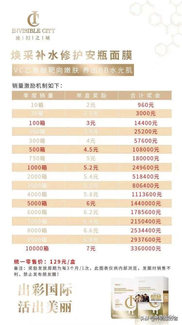 據(jù)了解,迷幻之城面膜的代理商一共分為三個級別,分別是省代:一箱就可以做代理,一箱48盒(一盒10片面膜),28元一盒;總代:拿貨5箱,23元一盒;股東:拿貨10箱,18元一盒,門檻為8640元。近公司還推出了一個新活動,活動內(nèi)容是一次進(jìn)貨10箱,拿到股東級別,再送400片面膜用作開發(fā)市場,算下來,每盒價格還不到18元。