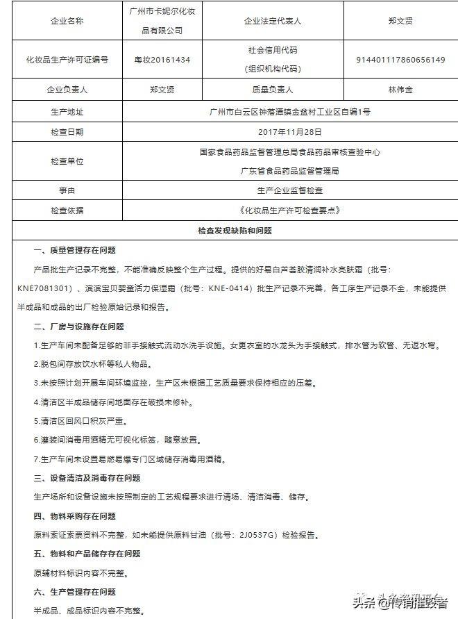 至于廣州市卡妮爾化妝品有限公司,據(jù)了解,迷幻之城系列產(chǎn)品正是出自該公司之手,2017年12月,食品藥品監(jiān)督管理總局通報了廣州市卡妮爾化妝品有限公司等企業(yè)的監(jiān)督檢查情況,該公司在生產(chǎn)環(huán)節(jié)存在多種問題。
