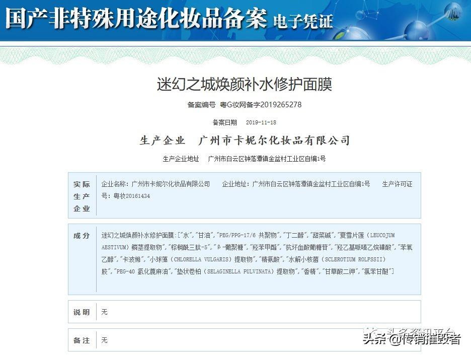 雖然不止一份宣傳材料聲稱其面膜具有美白的功能,然而事實(shí)卻是持否定態(tài)度的。經(jīng)查國產(chǎn)非特殊用途化妝品備案平臺,我們發(fā)現(xiàn)迷幻之城煥顏補(bǔ)水修護(hù)面膜的備案編號為“粵G妝網(wǎng)備字2019265278 ”,實(shí)際生產(chǎn)企業(yè)為廣州市卡妮爾化妝品有限公司,可見此產(chǎn)品屬于非特殊用途化妝品,宣傳特殊化妝品才具有的美白功,則涉嫌虛假宣傳。