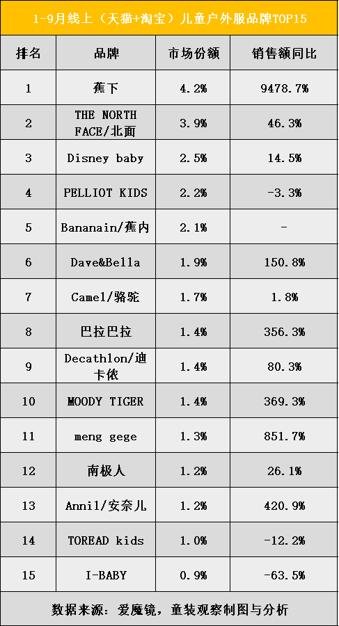 愛魔鏡數(shù)據(jù)顯示,截止2022年9月,在天貓、淘寶電商平臺上,兒童戶外服TOP15品牌總份額為28.3%,超過3%的只有蕉下和北面,分別占據(jù)4.2%、3.9%,可見兒童戶外服賽道并不集中,品牌想要突出的機(jī)會(huì)還是比較大的。