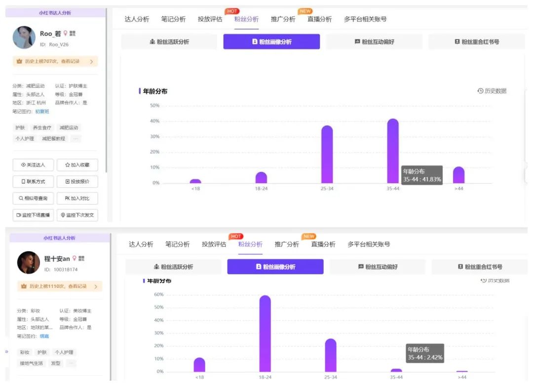 以40歲安妮姐姐與Roo_若為例,這2位博主在35-44歲的人群占比約為40%,而駱王宇和程十安這2位美妝頭部博主,該人群占比僅為個(gè)位數(shù)。