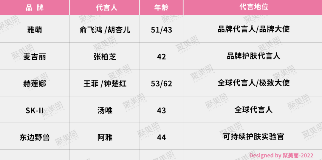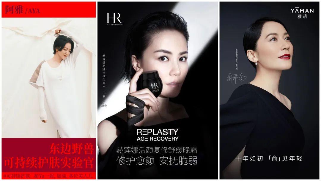 不僅僅是SK-II,赫蓮娜、雅萌,還有麥吉麗、東邊野獸等在內(nèi)的國(guó)內(nèi)中高端美妝品牌,其代言人里都有60后、70后明星的身影,且她們也大多擁有較高的“娛樂(lè)圈”地位。