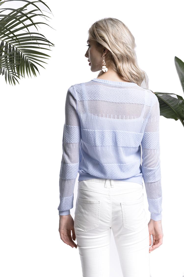 這款針織衫用不同薄厚及鏤空設(shè)計來增加整件衣服的層次感,讓看起來普通的針織衫不再單調(diào)無趣,上面的不同通透感的鏤空設(shè)計耐人尋味也透出一絲的性感。