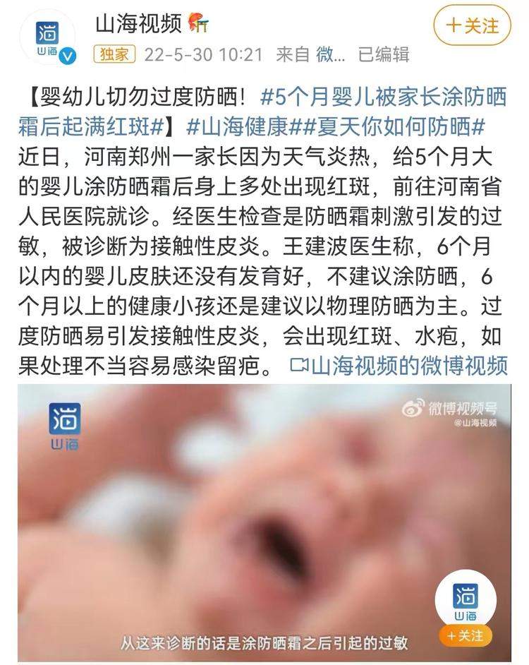 ■此前報(bào)道:5個(gè)月嬰兒因涂防曬霜導(dǎo)致接觸性皮炎/微博截圖
