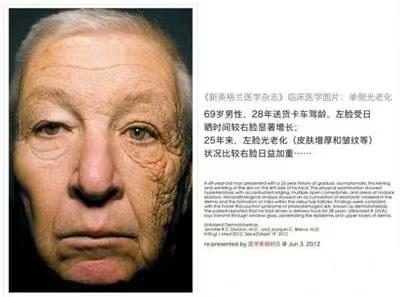 “光老化”現(xiàn)象是由一個知名美國雜志提出的,說的就是由于一個司機長期只有一半臉接受太陽的直射,在這種嚴(yán)格控制變量的對比試驗之下,他只有長期照射陽光的一半臉出現(xiàn)了嚴(yán)重的老化,體現(xiàn)為皮膚的松弛與褶皺,十分駭人。