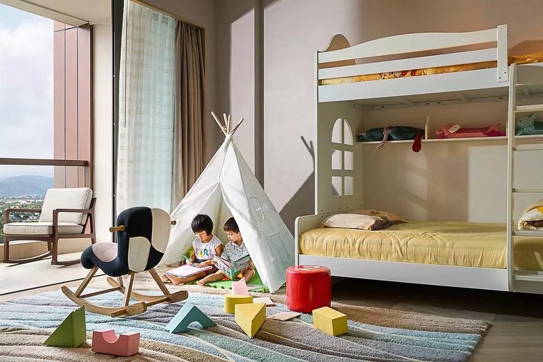 酒店還有家庭親子套房,整體布置童趣十足,設(shè)有清新自然的海洋主題兒童臥室及浴室,連衛(wèi)浴設(shè)施都是特別為小朋友量身打造,還有小帳篷、搖搖木馬玩偶、兒童智力拼圖積木等等,小朋友入住估計都舍不得出門啦!此外,酒店還有一個帶雙層滑梯的套房特別搶手!