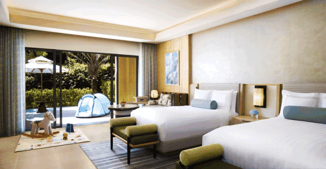客房面積60㎡起跳,大床1.8/雙床1.35,陽臺寬大,視野開闊,觀景套房各有特色,私家別墅更有獨立泳池。客房內(nèi)也貼心親子:提供木頭質(zhì)地的兒童床,可以一側(cè)與大床連在一起。提供小床內(nèi)的床上用品,以及兒童浴袍、兒童沙灘拖棉拖、小鴨子玩具和寶寶沐浴露等一系列兒童用品。