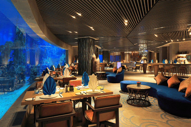 在酒店眾多餐廳中,備受客人傾心的無疑是濤·海底餐廳,猶如一座海洋館,一邊用餐一邊看繽紛多彩的魚兒游來游去,還有美人魚定時表演,還會特別游到寶貝旁邊比愛心,撒水花,這一點就能俘獲不少小朋友的心。白天這里還可以潛水喂魚,想體驗的爸媽可以一試。濤·海底餐廳提供名副其實的海鮮自助午餐晚餐,品種特別多,刺身蒸煮熱炒冷盤皆有,自助午餐團(tuán)購價每位400元出頭,性價比可以說是很高了。酒店還設(shè)有專門的觀光通道,不在此用餐的住客也可以欣賞曼妙的海底世界。