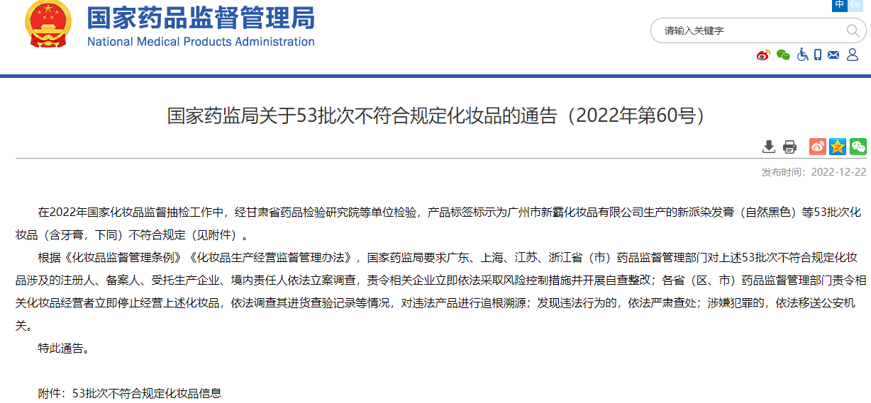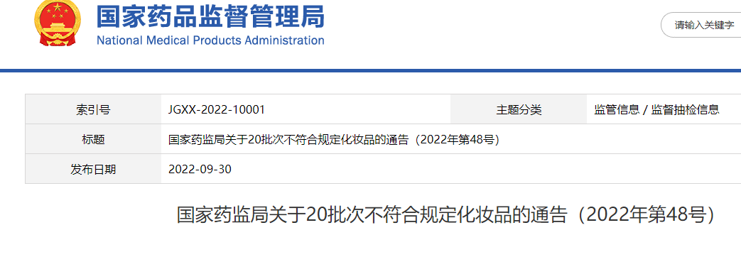 中國經(jīng)濟(jì)網(wǎng)北京12月23日訊 藥品監(jiān)督管理局網(wǎng)站日前公布《藥監(jiān)局關(guān)于53批次不符合規(guī)定化妝品的通告》(2022年第60號),在2022年化妝品監(jiān)督抽檢工作中,共發(fā)現(xiàn)資生堂“安熱沙水能戶外防曬乳”等53批次化妝品抽檢不符合規(guī)定。