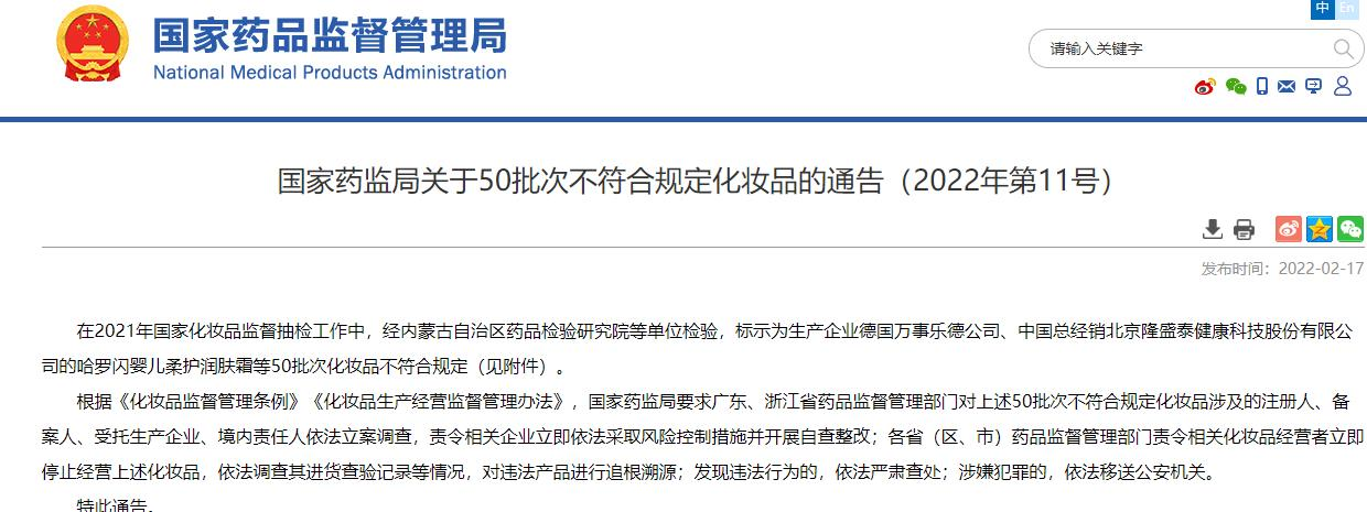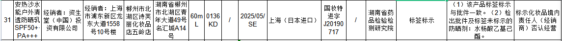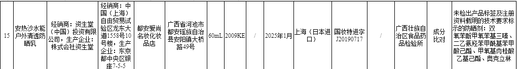 此外,藥品監(jiān)督管理局于2022年2月17日公布的《藥監(jiān)局關(guān)于50批次不符合規(guī)定化妝品的通告》(2022年第11號)顯示,經(jīng)銷者為資生堂(中國)投資有限公司、被抽樣單位為郴州市北湖區(qū)詩芙麗化妝品店五嶺店的安熱沙水能戶外清透防曬乳SPF50+·PA+++標(biāo)簽標(biāo)示不合格。
