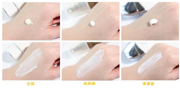 蘭蔻、歐萊雅和香蒲麗這三支的乳液質(zhì)地稍微厚重一些,尤其是香蒲麗,剛擠出來(lái)的時(shí)候更像是膏體的質(zhì)地,但是抹開(kāi)后還是挺水潤(rùn)的。