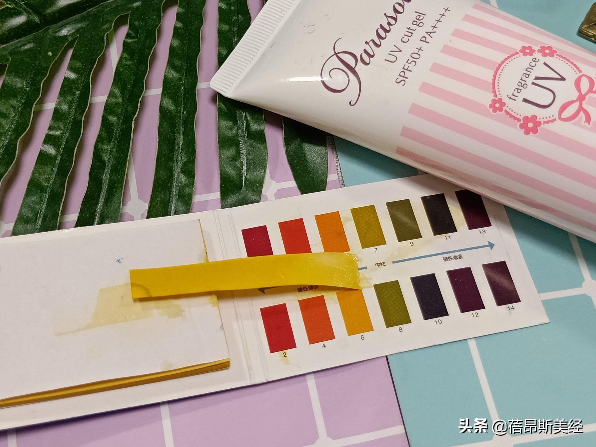 再看看溫和度。將防曬霜涂在PH試紙上,試紙顏色沒(méi)什么改變。對(duì)照色卡,其PH值在5.5-6.5之間,弱酸性,溫和親膚。