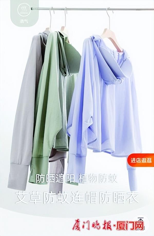 記者留意到,有部分防曬衣主打起保濕、驅(qū)蚊、抑菌等功能。駱駝品牌今夏推出一款玻尿酸面膜防曬衣,宣稱產(chǎn)品注入762MG/kg玻尿酸,通過與皮膚接觸,可以達(dá)到保濕作用。在淘寶平臺(tái),記者還找到一款防曬衣,稱添加艾草成分,能做到驅(qū)蚊防蟲、植物抗菌等多重功。