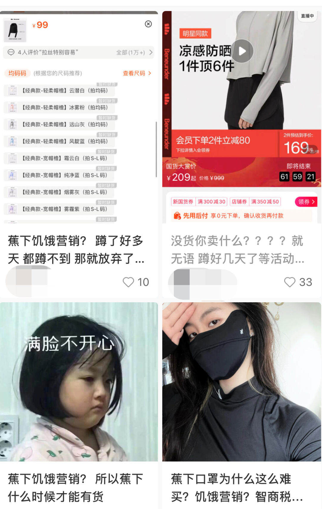 首先是多數(shù)網(wǎng)友都提出過(guò)的“饑餓營(yíng)銷(xiāo)”質(zhì)疑。2-3個(gè)月出一次新品的蕉下,其新品一直是限時(shí)限量搶購(gòu),熱門(mén)產(chǎn)品的熱門(mén)色號(hào),更是在618購(gòu)物節(jié)之前就已售罄。