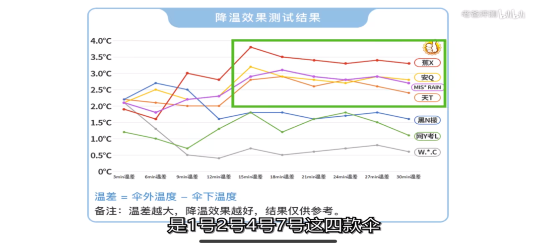 B站擁有260萬(wàn)粉絲的UP主“老爸評(píng)測(cè)”,曾對(duì)包括蕉下、天堂、網(wǎng)易考拉工廠店等7款UPF50+的防曬傘進(jìn)行測(cè)評(píng)。結(jié)果顯示,在太陽(yáng)直射30分鐘的情況下,蕉下傘降溫果比其他品牌多0.5攝氏度-1攝氏度,但高降溫不超過(guò)4攝氏度。