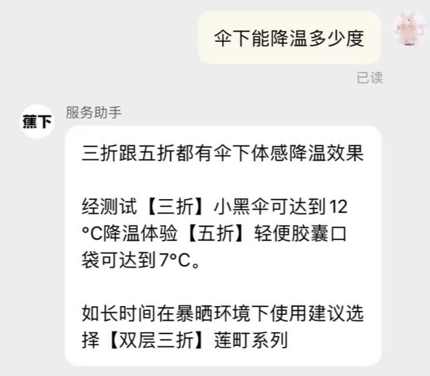 而蕉下天貓店客服稱,蕉下的三折小黑傘可達(dá)到12攝氏度降溫體驗(yàn),五折輕便膠囊口袋傘可達(dá)到7攝氏度。
