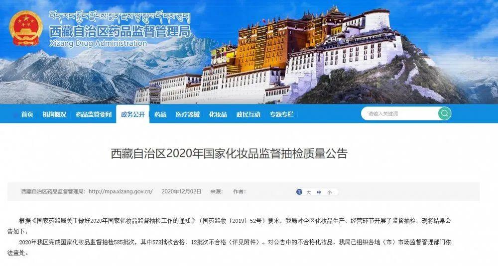 西藏自治區(qū)藥品監(jiān)督管理局網(wǎng)站近日發(fā)布的西藏自治區(qū)2020年化妝品監(jiān)督抽檢質(zhì)量公告顯示,本次抽檢化妝品產(chǎn)品585批次,其中573批次合格,12批次不合格。對公告中的不合格化妝品,已組織各地(市)市場監(jiān)督管理部門依法查處。
