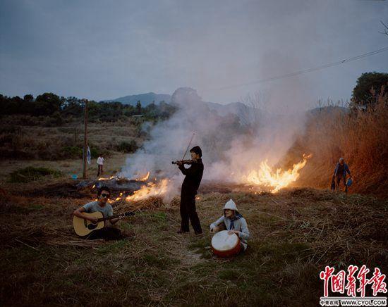 3月14日傍晚,福建省福州市閩侯縣關中村,“南部生活”共識社區(qū)成員在墾荒前將蘆葦和野草燒掉,日本建筑師吉富遙樹、社區(qū)發(fā)起人唐冠華和邢振(左至右)見到燒荒的場景,臨時起意來到現場演奏。