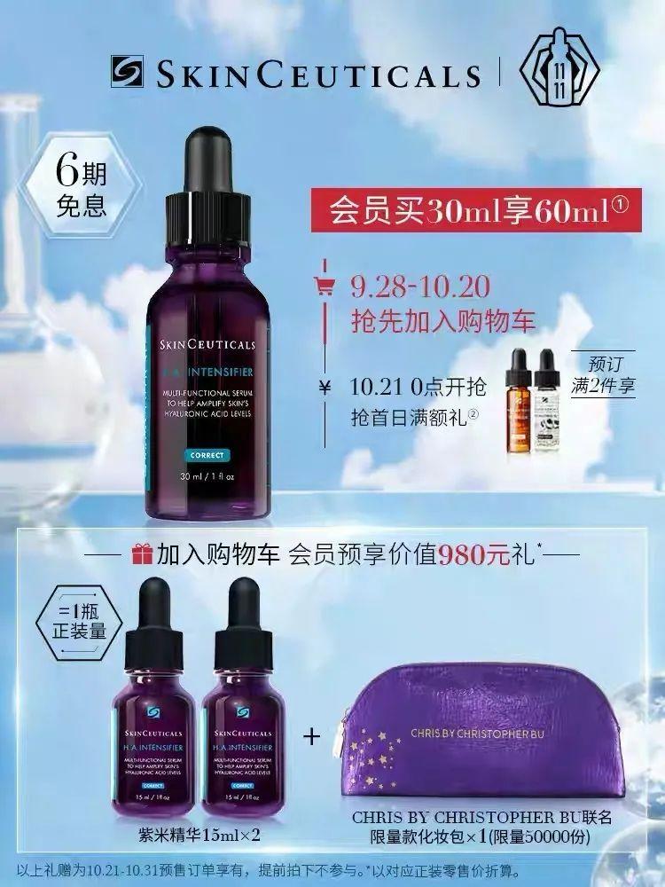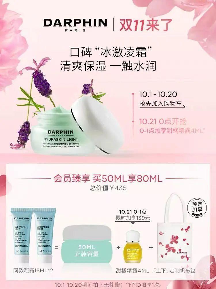 禮贈:①買50ml送60ml同款小樣(30ml*2),實際到手110ml;②活動價419元,可領(lǐng)30元優(yōu)惠券,雙十一跨店滿減40元,實際到手349元。