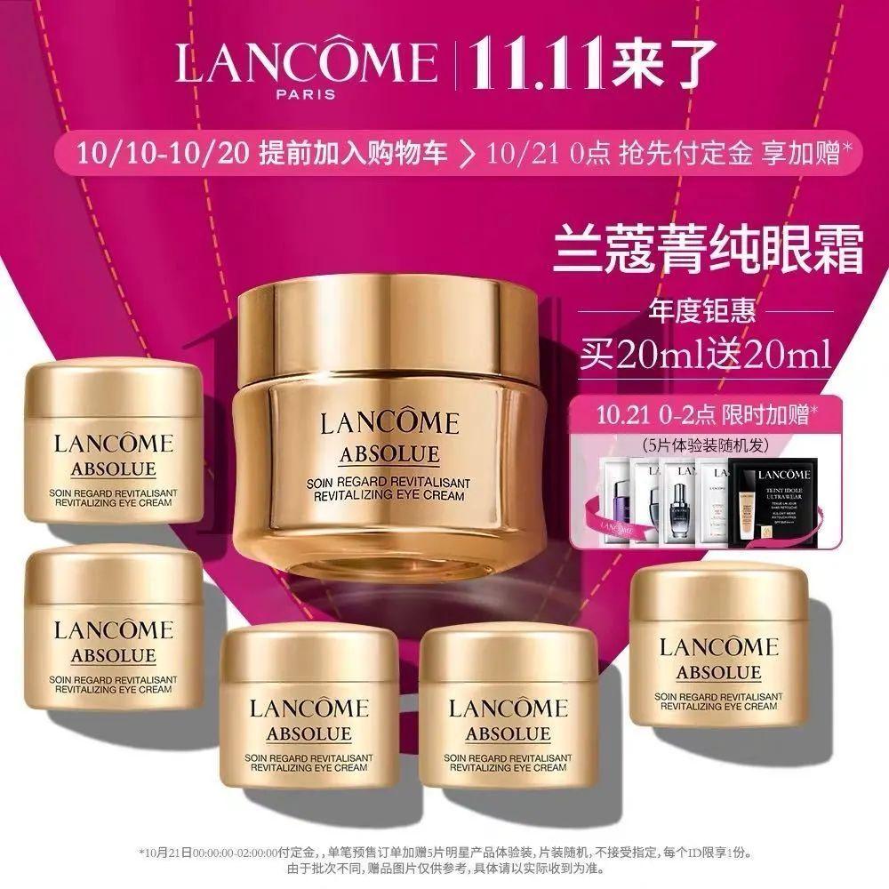禮贈:買20ml送20ml同款小樣(4ml*5),實際到手眼霜40ml。再送菁純系列5片裝隨機,及蘭蔻定制化妝包一只。