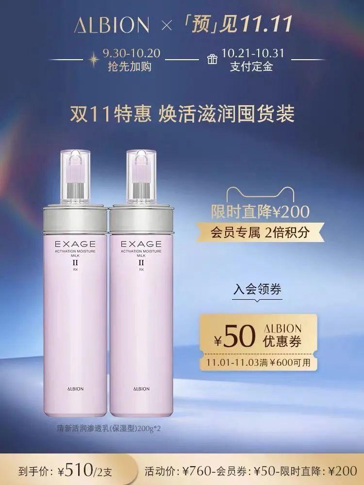 禮贈:①買1支50ml正裝,送1支50ml同款正裝,實際到手乳液100ml;②原價278元,雙11預(yù)售價139元/2支