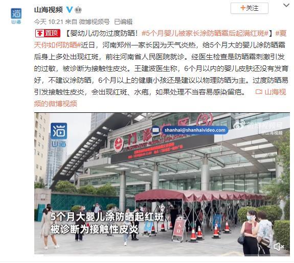 近日,河南鄭州一家長因為天氣炎熱,給5個月大的嬰兒涂防曬霜后身上多處出現紅斑,前往河南省人民醫(yī)院就診。經醫(yī)生檢查是防曬霜刺激引發(fā)的過敏,被診斷為接觸性皮炎。王建波醫(yī)生稱,6個月以內的嬰兒皮膚還沒有發(fā)育好,不建議涂防曬,6個月以上的健康小孩還是建議以物理防曬為主。過度防曬易引發(fā)接觸性皮炎,會出現紅斑、水皰,如果處理不當容易感染留疤。