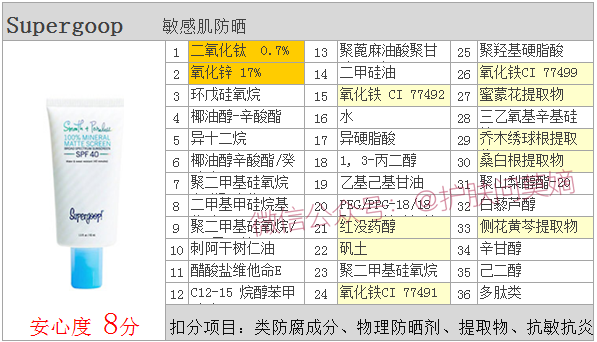 很顯然, 這2款防曬霜中沒有使用化學防曬劑。目前業(yè)界的共識就是,從對皮膚的性角度來說,化學防曬成分的刺激性>物理防曬劑。