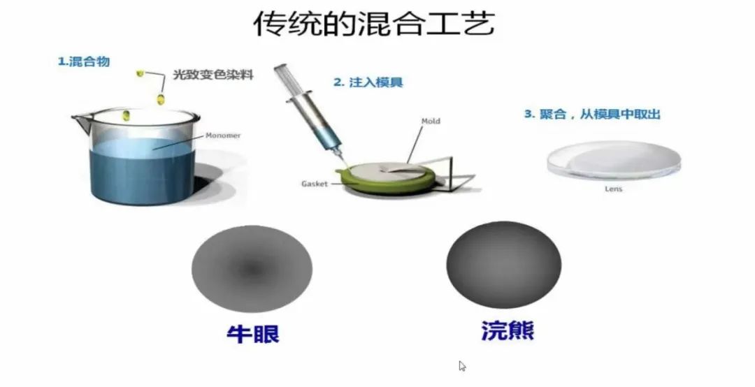 傳統(tǒng)的變色鏡片工藝 —— 基變工藝,是將變色染料注入片基中,通過基片混合變色物質制成的光致變色片,因邊緣厚度與中心厚度相差較大,變色后鏡片顏色深淺不一,會出現(xiàn)“牛眼”、“浣熊”等現(xiàn)象影響外觀。