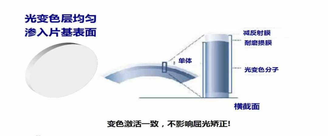 新一代的變色鏡片工藝 —— 膜層變色工藝(膜變),是通過將變色物質滲透基片表面制成的光致色片,顏色均勻,褪色變色速度快,且為可分裂重組的納米復合材料基材。尤其適合矯正視力度數(shù)較高的顧客,并可附加在各種功能型鏡片上。