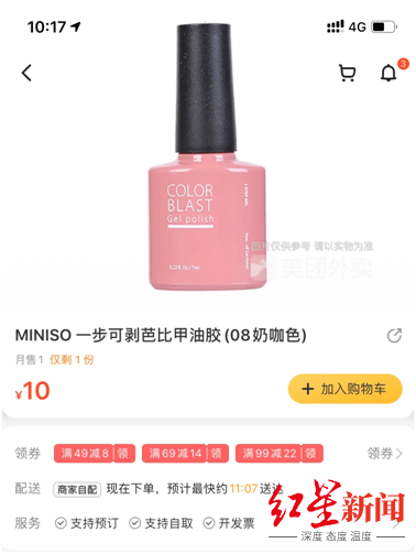 記者以“一步可剝”為關(guān)鍵詞在名創(chuàng)優(yōu)品天貓旗艦店搜索,已找不到任何產(chǎn)品。不過(guò)美團(tuán)外賣來(lái)看,附近的門店僅能找到一款名為“一次可剝芭比甲油膠”的商品。