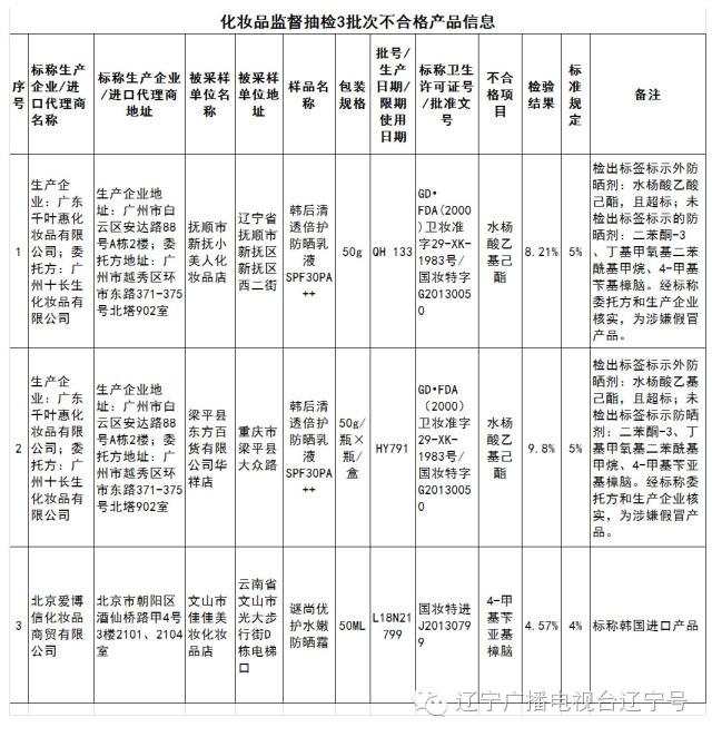 標(biāo)稱廣東千葉惠化妝品有限公司(委托方:廣州十長(zhǎng)生化妝品有限公司)生產(chǎn)的2批次韓后清透倍護(hù)防曬乳液SPF30PA++檢出水楊酸乙基己酯超標(biāo)。這2批不合格化妝品種,其中1批次在遼寧省檢出,被采樣單位為撫順市新?lián)嵝∶廊嘶瘖y品店。而經(jīng)過對(duì)標(biāo)稱生產(chǎn)企業(yè)和委托企業(yè)的現(xiàn)場(chǎng)核查,2批次標(biāo)稱韓后清透倍護(hù)防曬乳液SPF30PA++的產(chǎn)品為涉嫌假冒產(chǎn)品。