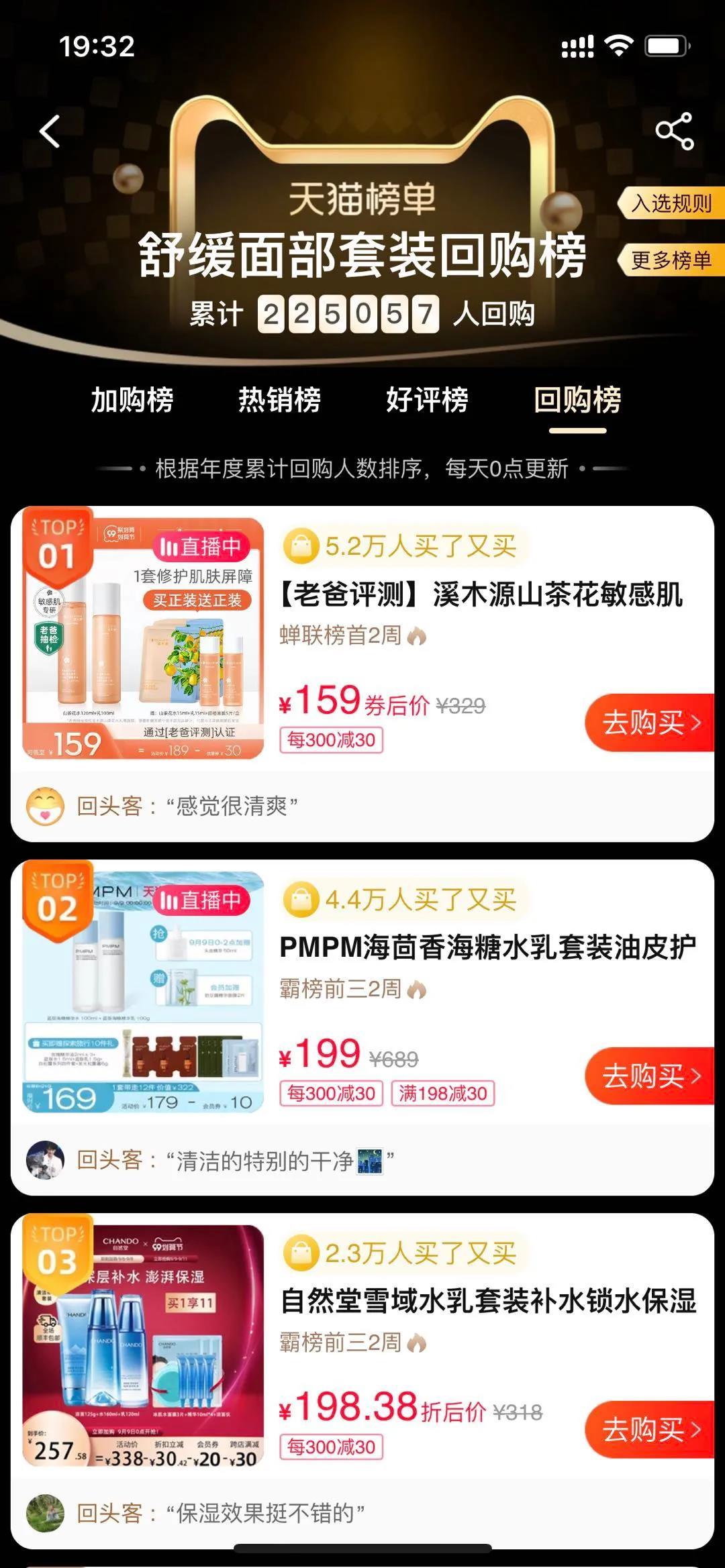 7月下旬至今,山茶花水乳套裝穩(wěn)居天貓舒緩面部套裝熱銷榜、好評(píng)榜、回購(gòu)榜三榜第一名。其中,好評(píng)榜是根據(jù)近30天已購(gòu)買(mǎi)、使用消費(fèi)者的好評(píng)占總評(píng)價(jià)數(shù)的比率排序,回購(gòu)榜是根據(jù)2021年度累計(jì)回購(gòu)人數(shù)排序,這代表該套裝不僅賣得好,而且廣受好評(píng),復(fù)購(gòu)率也在天貓美妝。