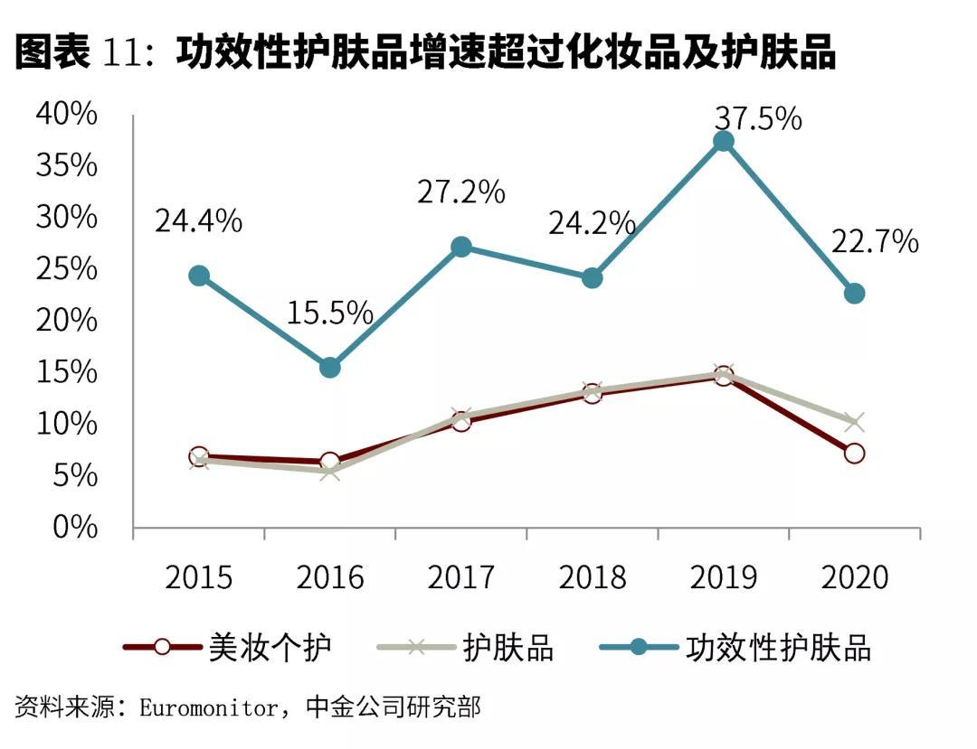 據(jù)歐睿國(guó)際數(shù)據(jù)預(yù)測(cè),到2024年,中國(guó)功能性護(hù)膚品市場(chǎng)規(guī)模將突破千億元,占整體護(hù)膚品市場(chǎng)的22.9%。功能性護(hù)膚品市場(chǎng)的增長(zhǎng)率遠(yuǎn)超整個(gè)護(hù)膚品市場(chǎng)的增長(zhǎng)率,2015-2020年,中國(guó)功能性護(hù)膚品市場(chǎng)的復(fù)合年均增長(zhǎng)率達(dá)25.2%,高于同期美妝個(gè)護(hù)市場(chǎng)10.3%、護(hù)膚品市場(chǎng)10.9%的增長(zhǎng)率,可見(jiàn),功能性護(hù)膚品行業(yè)正處于快速成長(zhǎng)期。