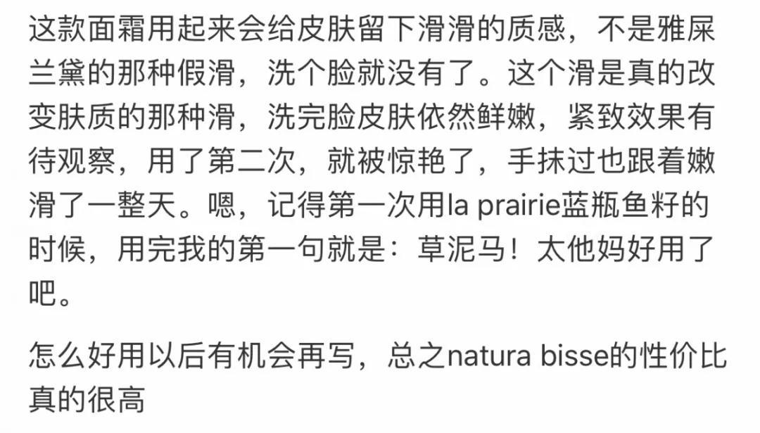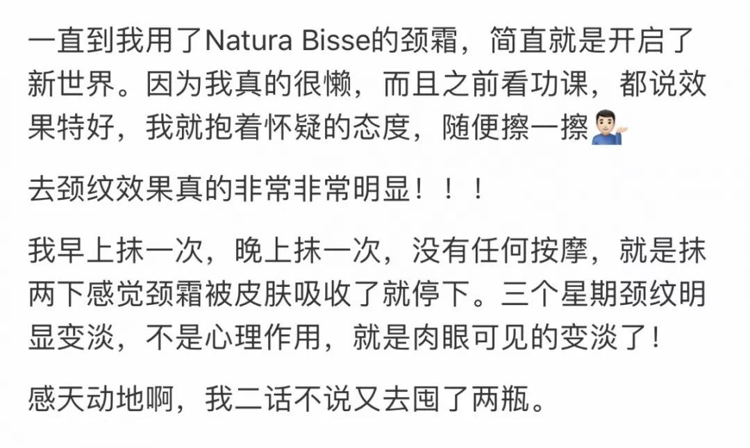Natura Bisse的頸霜也是明星產(chǎn)品,據(jù)說(shuō)嬌韻詩(shī)和資生堂悅薇,淡化頸紋的果十分。它的質(zhì)地很扎實(shí),倒扣都不會(huì)掉下來(lái)那種,吸收很快,號(hào)稱是微注射的替代選擇,除了去頸紋之外,還有提亮脖子膚色的作用,脖子肉眼可見(jiàn)的變白!塑造頸部線條,消除雙下巴都有用。的缺點(diǎn),貴!