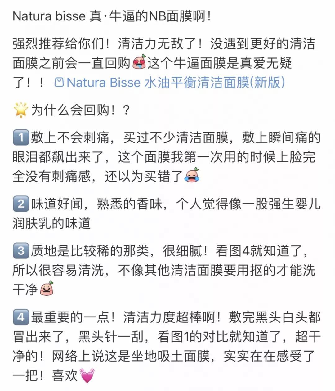 這款Natura Bisse凈透潔膚面膜又叫“拋光面膜”,傳說(shuō)有“坐地吸土”的功,所以也被笑稱“NB面膜”,好多人說(shuō)是用過(guò)好用的清潔面膜。敷起來(lái)是泥膜,洗的時(shí)候就變成洗面奶了,延展性特別好,10min-15min可以洗掉,是包含卸妝果的深層清潔。
