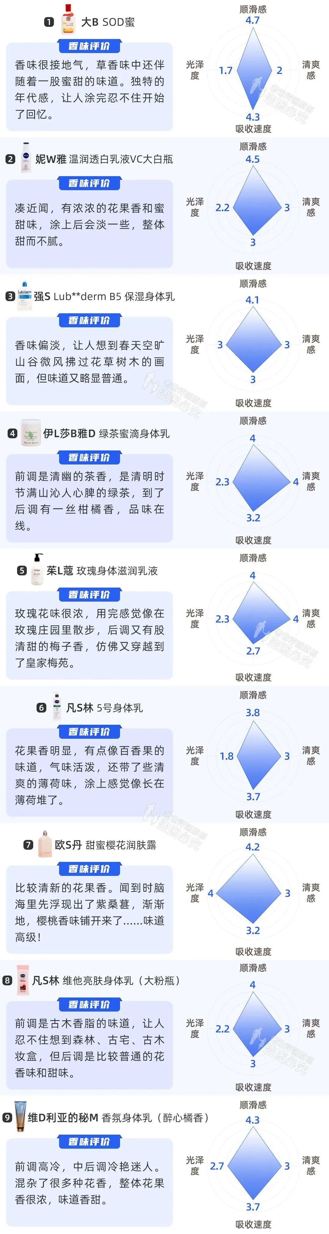 根據(jù)參與者打分,本期樣品中 2 號(hào)妮W雅,7 號(hào)歐S丹、12 號(hào)寶J米從、13 號(hào)雪L妃的香味,大家喜歡程度更高!想看所有身體乳的主觀喜歡程度的,后臺(tái)回復(fù)【身體乳】查看。