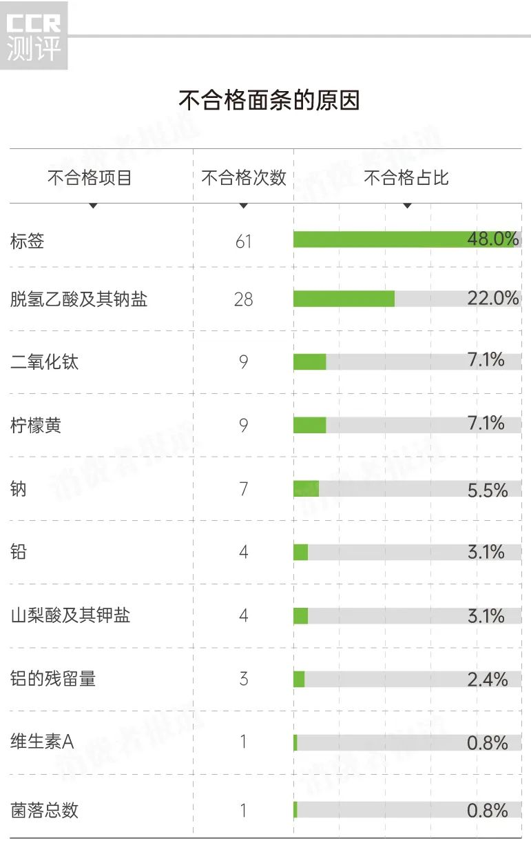 二、不合格面條多標簽不規(guī)范、亂用食品添加劑抽檢結果顯示,此次面條不合格的原因主要有以下幾種情況: