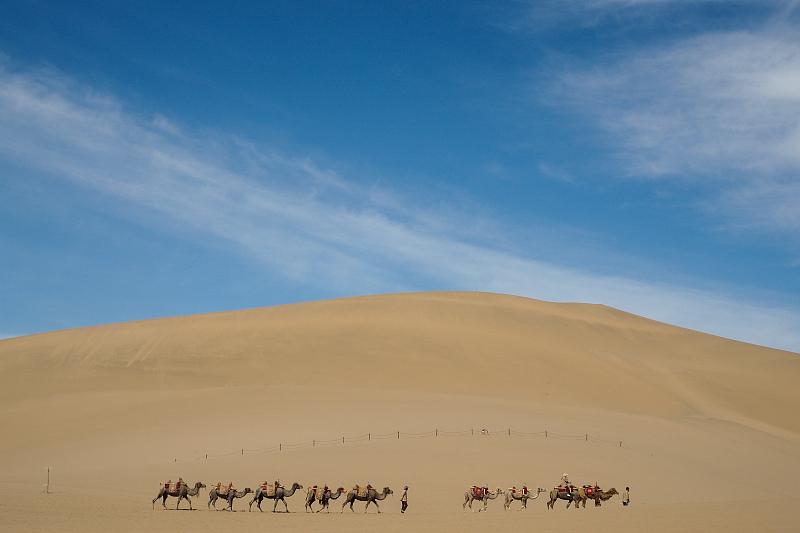 敦煌新城沿著黨河兩岸分布,黨河西岸,一條與河流成大約45度夾角的主干道,筆直地通往鳴沙山月牙泉的方向,這便是“鳴山路”。沿著鳴山路一路向南會經(jīng)過敦煌博物館、敦煌雷音寺、月牙泉小鎮(zhèn),后抵達廣褒的鳴沙山,以及月牙泉。剛到敦煌,不妨就先沿著鳴山路游玩。