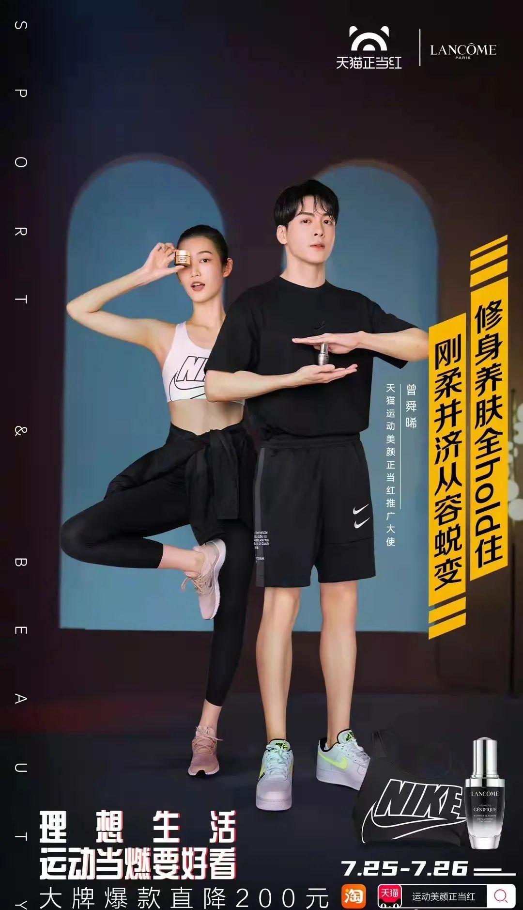 2020年,天貓開展“運動美顏正當(dāng)紅”的活動,Nike×蘭蔻、匡威×歐萊雅、安德瑪×安熱沙、哥倫比亞×博朗圣泉聯(lián)名形成“CP玩法”,并在微博發(fā)起“健身素顏妝”等話題試圖打通運動與美妝。