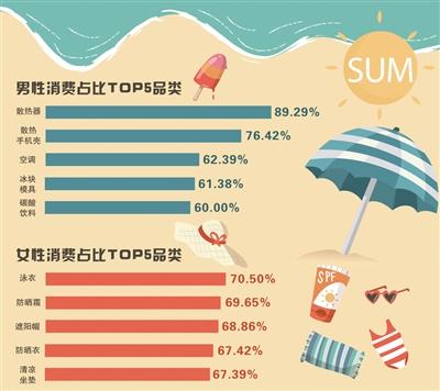 京東大數(shù)據(jù)的全國用戶畫像顯示,男性消費(fèi)者不忘給自己的電子裝備降溫,而女性消費(fèi)者則注重自身的防曬,時刻讓自己“白白的”。男性消費(fèi)占比TOP5品類是散熱器、散熱手機(jī)殼、空調(diào)、冰塊模具、碳酸飲料,男性占比分別達(dá)到89.29%、76.42%、62.39%、61.38%、60.00%;女性消費(fèi)占比TOP5品類:泳衣、防曬霜、遮陽帽、防曬衣、清涼坐墊,女性占比分別達(dá)70.50%、69.65%、68.86%、67.42%、67.39%。